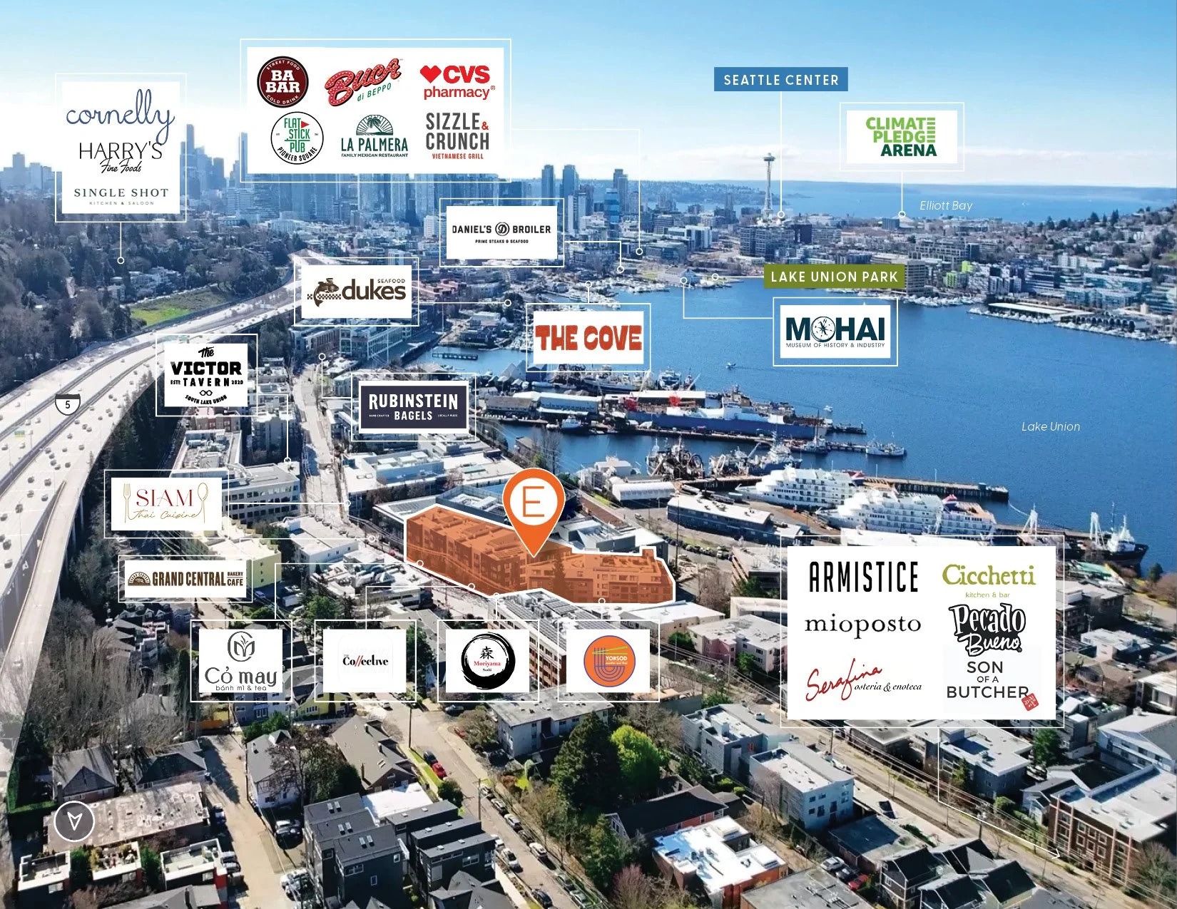 Residents are within walking distance of the South Lake Union technology and life sciences hub, home to major employers including Amazon, Google, Fred Hutchinson Cancer Center, and more. Ongoing improvements along the Eastlake Avenue corridor will further enhance connectivity to additional employment centers throughout the city, including dedicated bike lanes and bus rapid transit service anticipated to be completed by 2027.